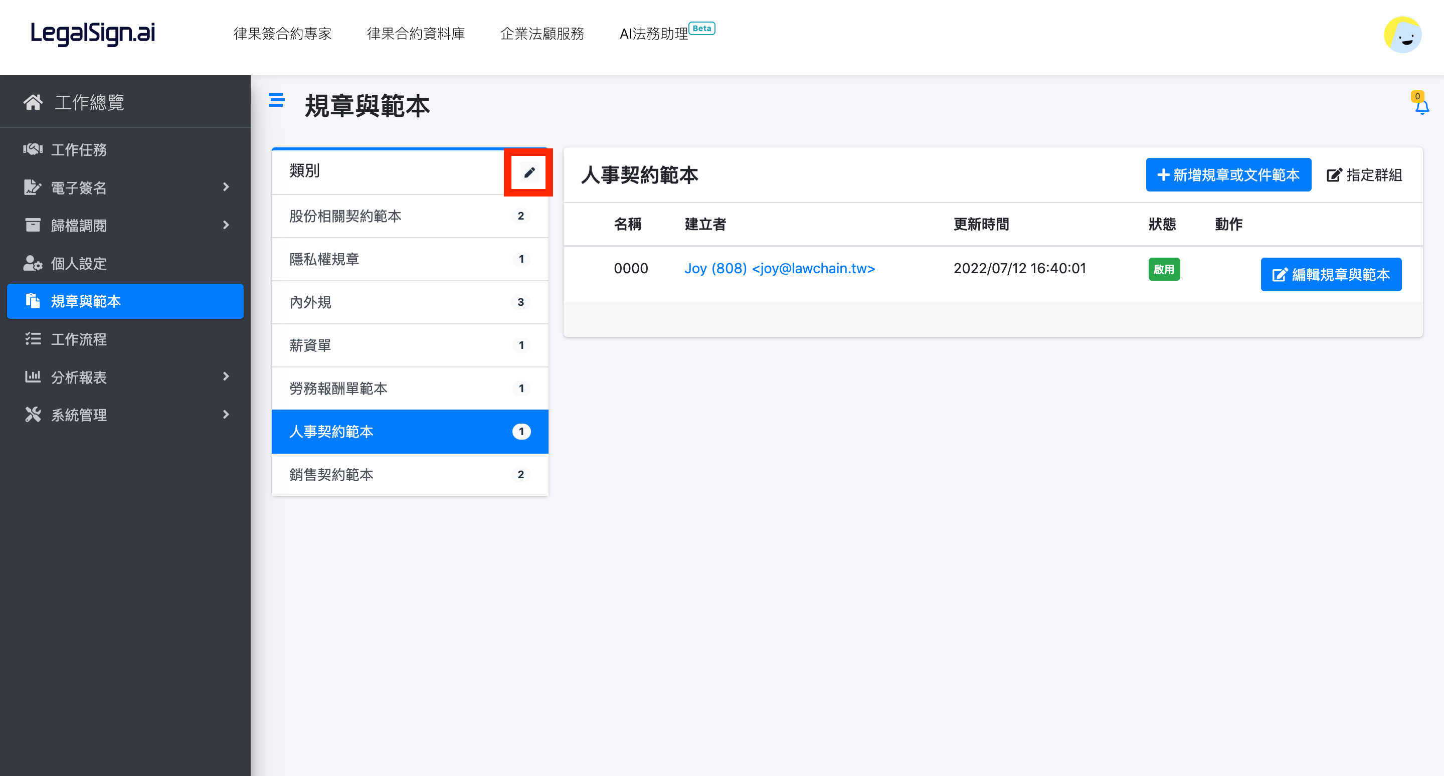 1. 首先進入LegalSign.ai系統,在左側工具列選擇進入「規章與範本」